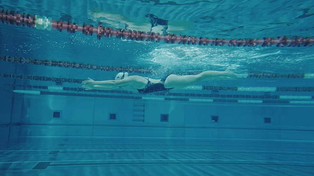 » Delphinbeinschlag, Kopf absenken und Abwärtsdrücken beider Handflächen